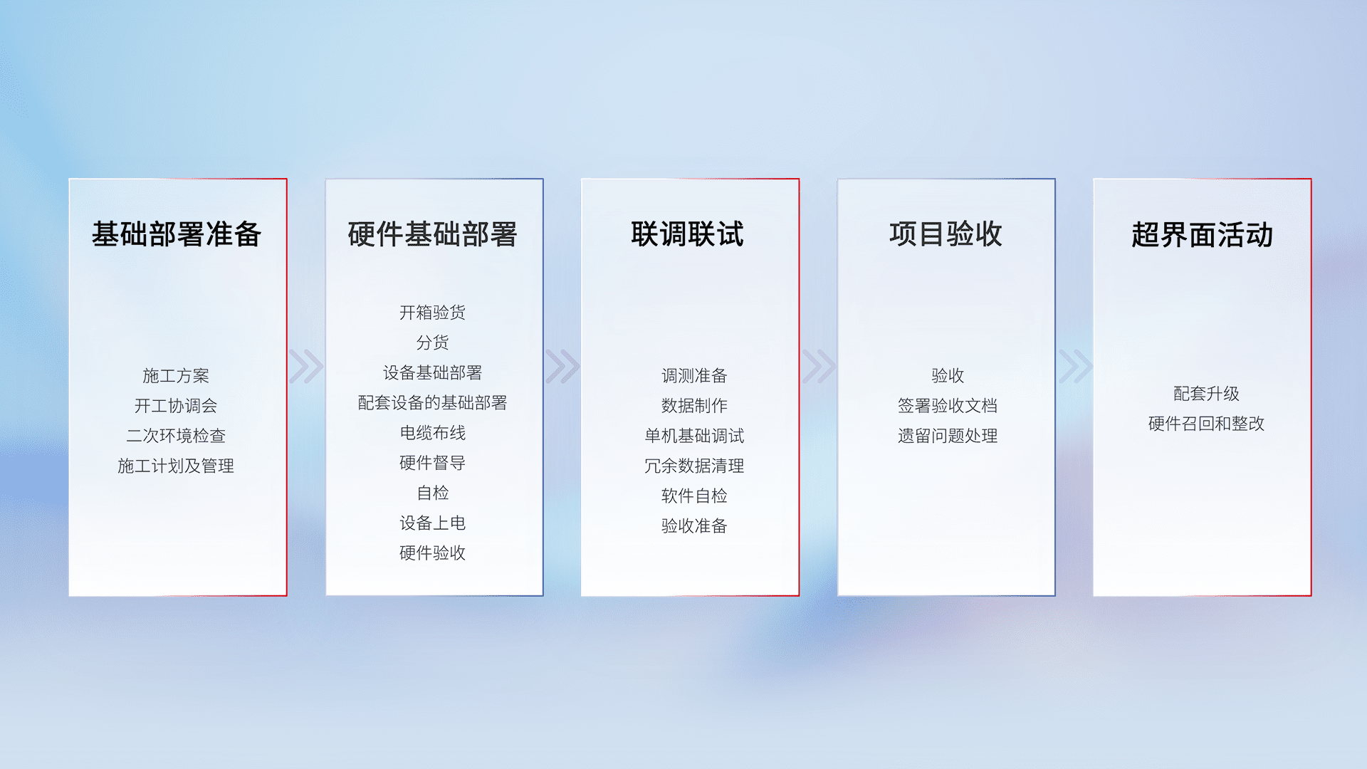 从基础部署准备、、、、硬件基础部署、、联调联试、、、项目验收、、越界面活动的全过程可追溯,,保证施工质量和进度。。。
